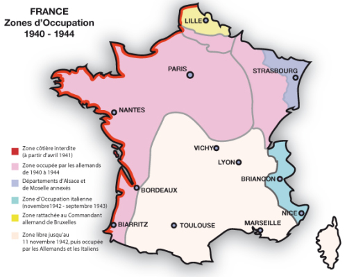 "Quand les Allemands ont envahi la France en juin 1940, il a fallu enlever tous les drapeaux français sur les monuments publics et ils ont été remplacés par des drapeaux nazis. En outre, tous les panneaux indicateurs français ont été remplacés par des panneaux en allemand. Pendant quatre ans, il était interdit d'arborer les couleurs nationales sous peine d'arrestation.
